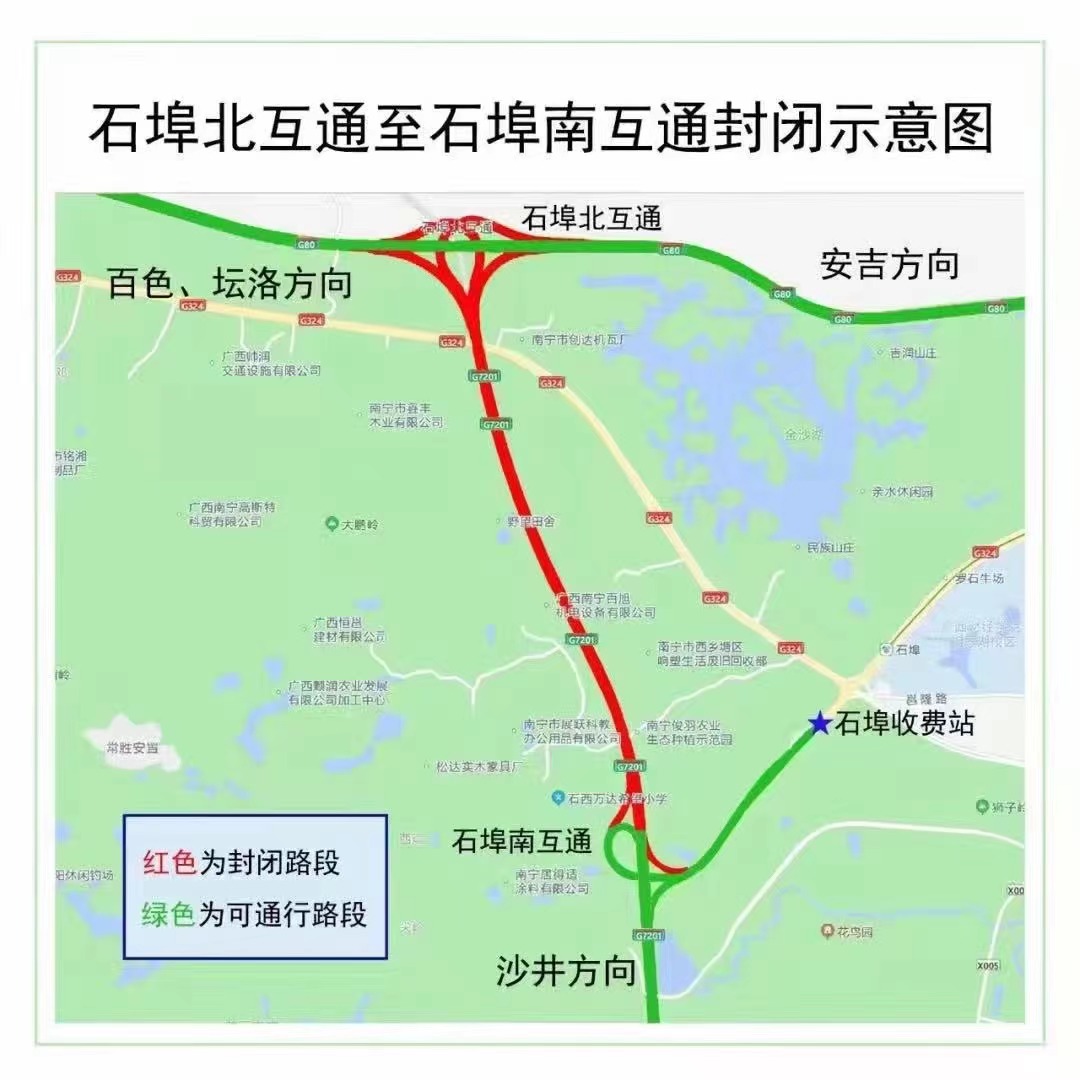 对南宁绕城高速(石埠南互通一石埠北互通)实施封闭道路施工,该段南宁绕城高速及石埠北互通匝道全部封闭,车辆强制绕行。