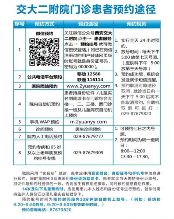 我院门诊全面实行实名分时段预约制,普通患者预约成功后在就诊时间段内通过预检分诊处进入,就诊结束从医院南门“出口”离开。