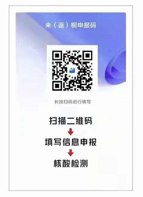 请提前扫描“来(返)桐申报码”进行申报,途中务必做好个人防护。点击查看>>
