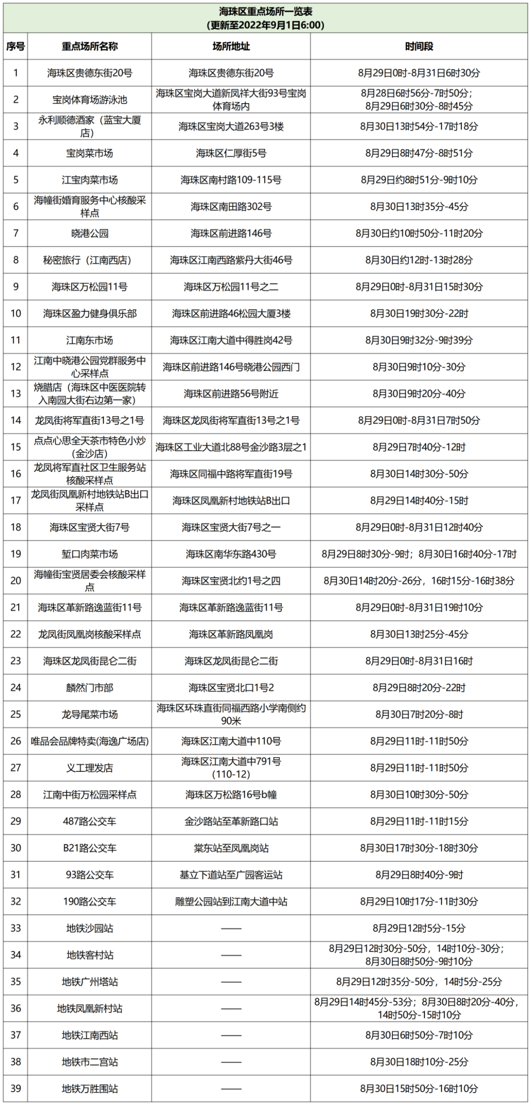据“广州海珠发布”消息,因疫情防控需要,请在相关时段到过以下重点场所的人员,立即主动向所在社区(村)报备,开展“3天2检”自我健康监测,并配合做好疫情防控措施。重点场所名单见下表,后续将按实际情况更新。