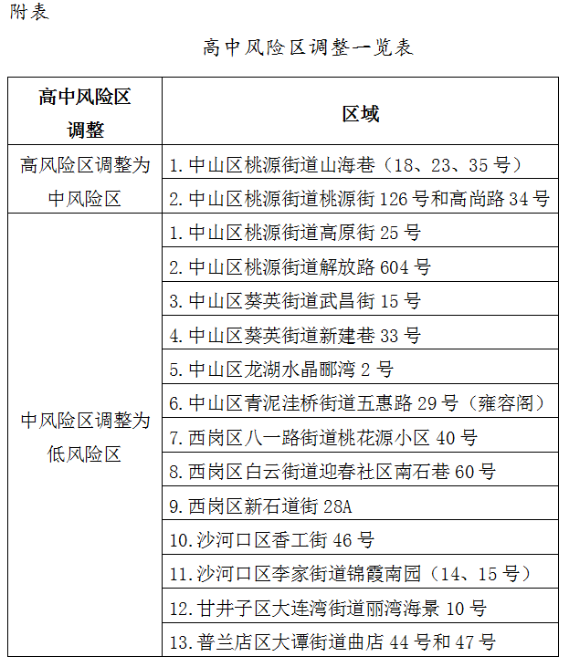 按照国务院联防联控机制《新型冠状病毒肺炎防控方案(第九版)》等规定,市疫情防控总指挥部决定,即日起将我市中山区桃源街道山海巷(18、23、35号)等2个高风险区调整为中风险区,将中山区桃源街道高原街25号等13个中风险区调整为低风险区(详见附表),并实施相应防控措施。