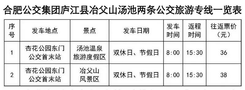 为改善庐江县部分旅游景点公共交通环境,方便合肥市民前往冶父山、汤池两处景点观光休闲、旅游度假,助力发展旅游经济,推进乡村振兴,自2022年9月10日起,合肥公交集团每逢双休日、节假日开行合肥市杏花公园到庐江县冶父山、汤池的两条旅游公交专线。详情见一览表。