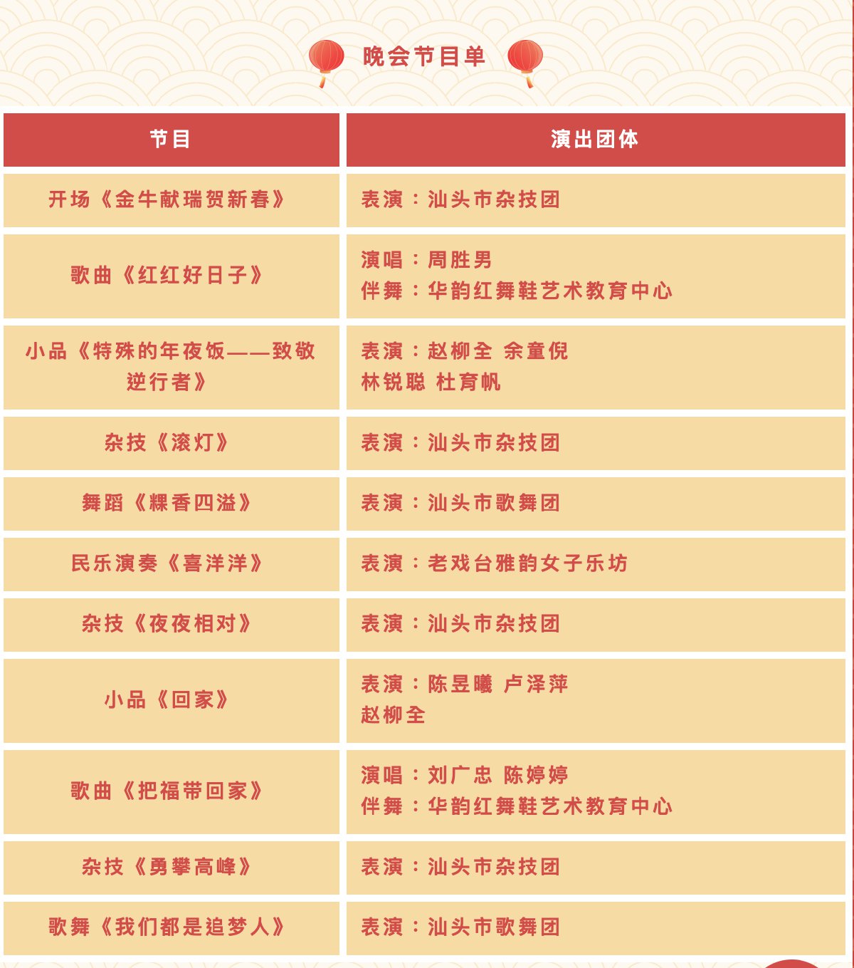本场晚会由汕头市文化集团主办,将整合旗下团体资源优势,利用网络直播平台,对整场网络春晚进行全方位呈现。各文艺团体将精心筹备,拓展文化集团文艺品牌,献上一系列反映时代呼声、陶冶高尚情操的优秀作品,让市民观众在家也能观潮韵风采、赏文艺魅力。
