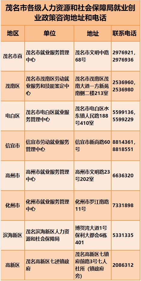 以下为茂名各区人社局就业创业政策咨询地址及电话联系方式。