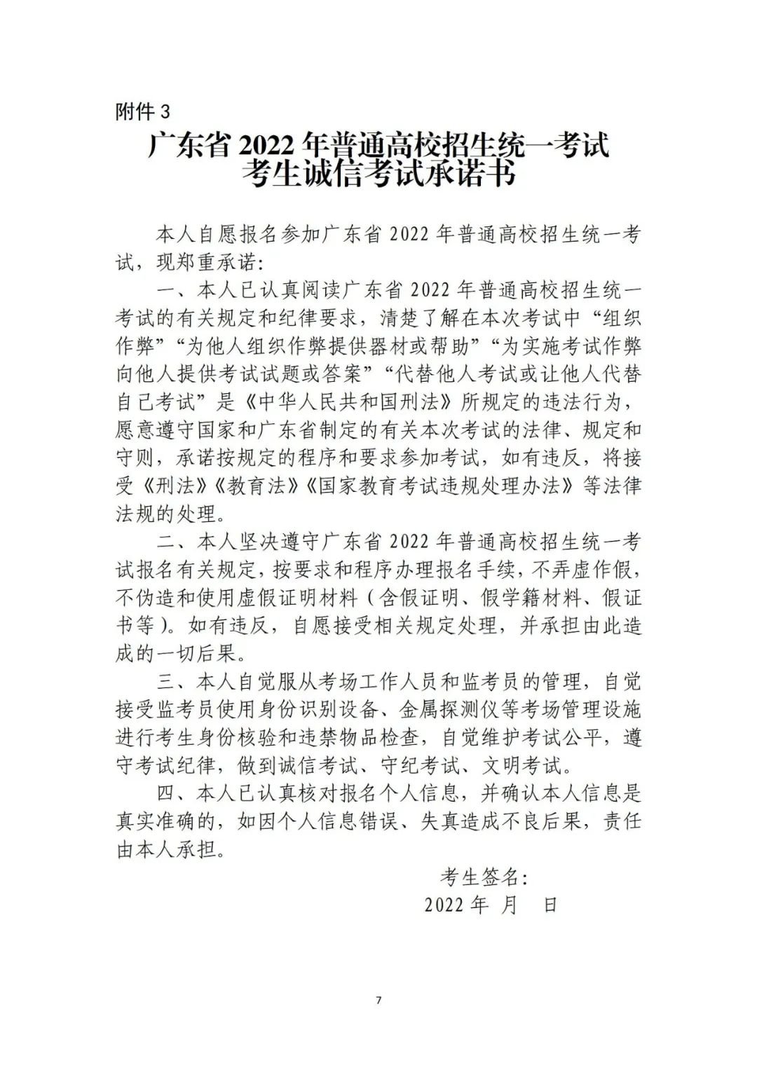 3.广东省2022年普通高考补报名考生诚信考试承诺书
