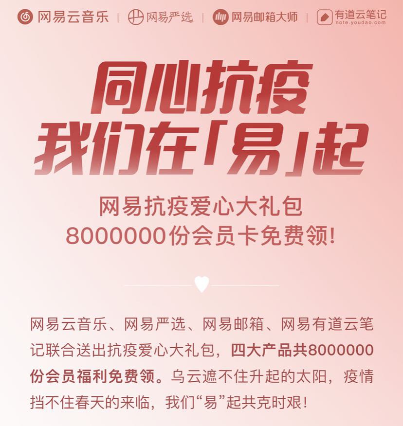 3月15日网易云音乐官方微博宣布,网易云音乐、网易严选、网易邮箱、网易有道云笔记联合送出抗疫爱心大礼包,四大产品共8000000份会员福利免费领取。