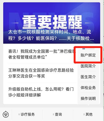 1、关注“太仓市第一人民医院”公众号,在菜单栏的“其他”→“账户绑定”中进行绑定。