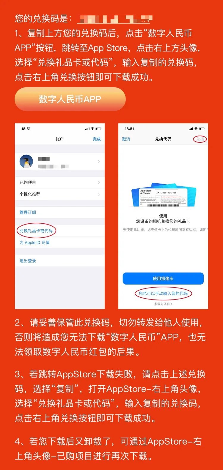 ▶您可以复制该兑换码,点击下载页上“数字人民币APP”按钮,跳转至App store进行下载“数字人民币APP”或点击复制兑换码,打开手机App Store,点击右上方头像,选择“兑换礼品卡或代码”位置。