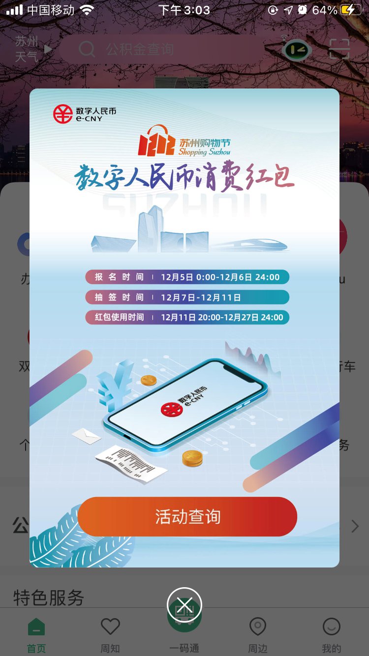 3、查询入口:苏周到APP首页弹屏推广位或服务入口“双12红包”