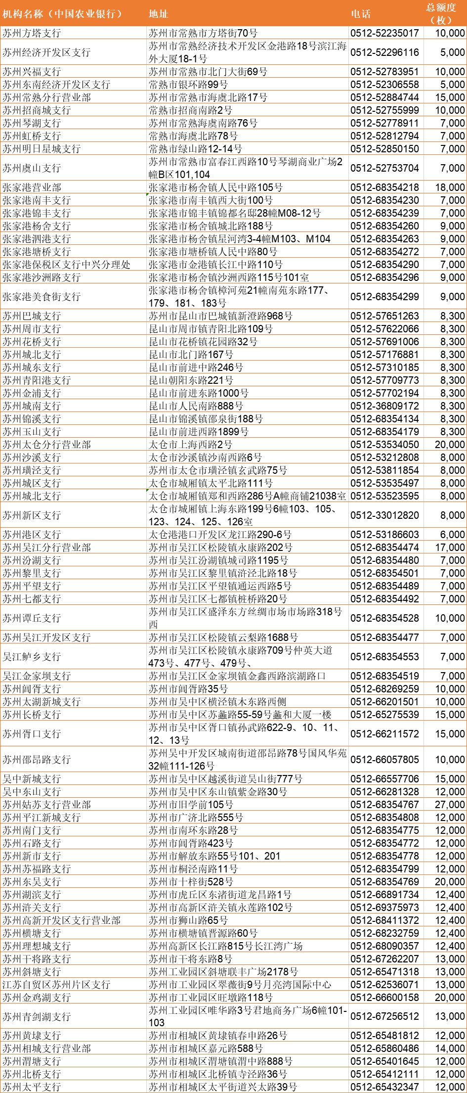 | 机构名称(中国农业银行) | 地址 | 电话 | 总额度(枚) |