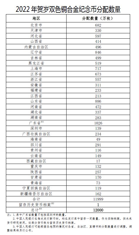 双色铜合金纪念币面额为10元,发行量1.2亿枚(含留存历史货币档案1万枚),各省、自治区、直辖市双色铜合金纪念币分配数量如下: