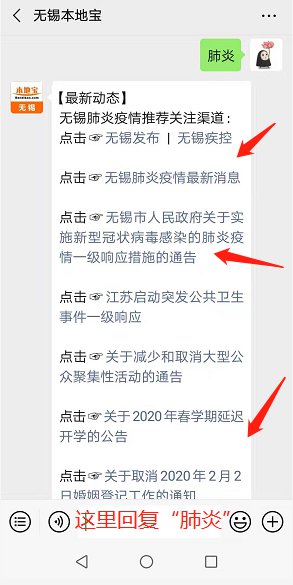 温馨提示:更多无锡新型冠状肺炎预防、最新情报、发热门诊定点医院等,微信搜索公众号“无锡本地宝”,在公众号聊天框回复“肺炎”查询无锡发热门诊、定点医院名单,新型冠状肺炎最新消息、肺炎预防措施等;回复“闭馆”,查询无锡各景区、文化场馆关闭通知及后续开园通知!