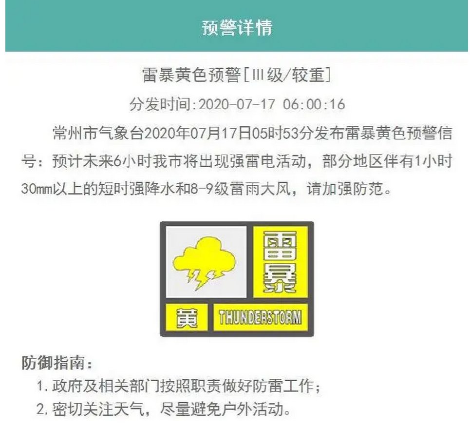 常州市气象台2020年07月17日05时53分发布雷暴黄色预警信号: