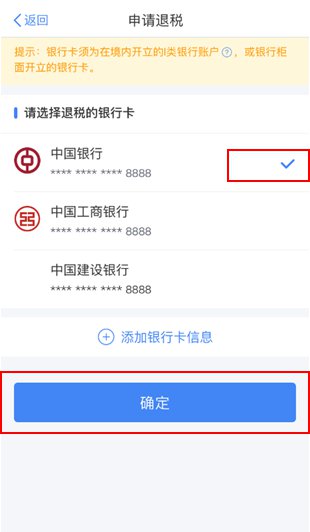 点击【申请退税】后,纳税人需选择退税银行卡。如前期已添加过银行卡,系统将自动带出已填银行卡信息。您需新增,点击【添加银行卡信息】—【确定】。