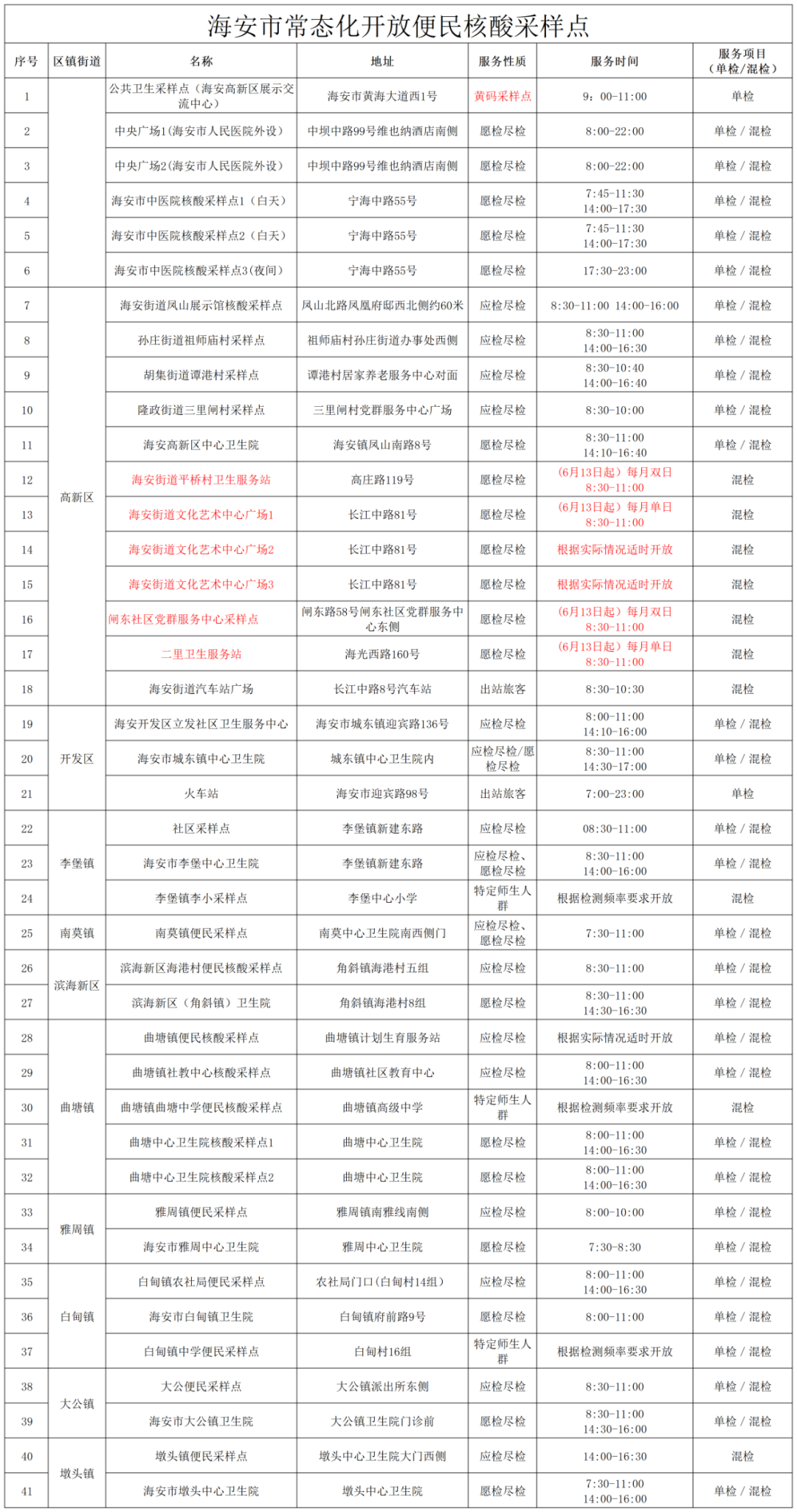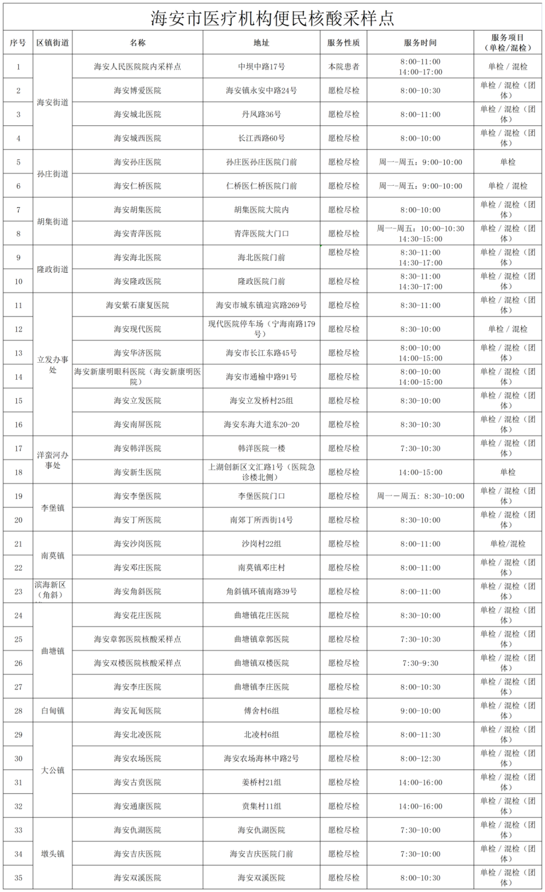 为方便广大市民群众接受就近、便捷、常态化核酸检测服务,我市将开放常态化便民核酸采样点,现公布如下。海安市便民核酸采样点共分“愿检尽检”、“应检尽检”及“区域巡检”采样点三类。