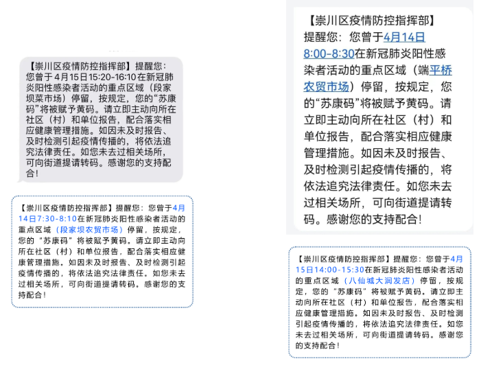 崇川疾控提醒:该短信内容真实,请收到短信的居民不要恐慌,如有相关轨迹,请第一时间向街道报备,务必落实好个人防护,避免与他人接触;如确实无相关轨迹,被错赋黄码,发现后可联系社区进行申诉转码。若隐瞒行程,瞒报漏报,引起疫情传播,将依法追究法律责任。