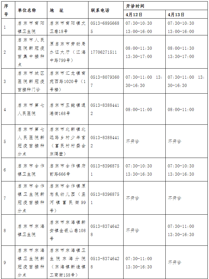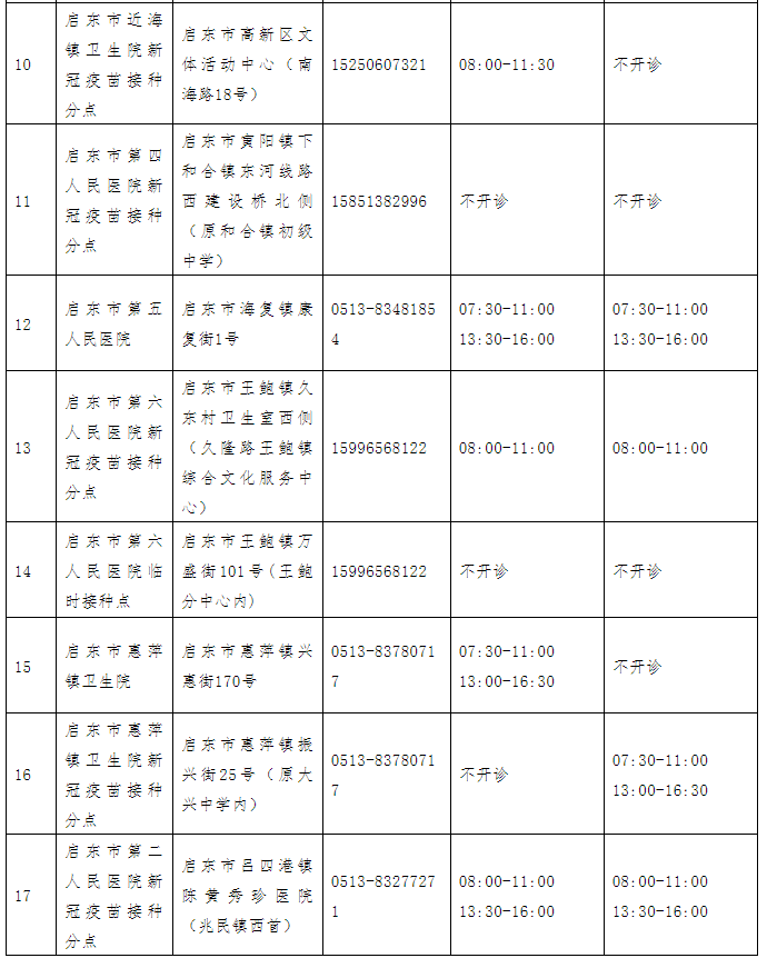 启东市新冠接种门诊可以接种的新冠疫苗有:北京生物新冠灭活疫苗、科兴中维新冠灭活疫苗、深圳康泰新冠灭活疫苗、康希诺腺病毒疫苗、智飞CHO疫苗。启东市有序恢复新冠病毒疫苗接种工作,接种服务时间如下:
