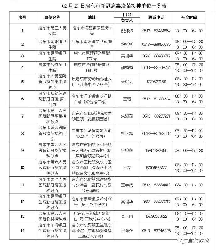 2月21日启东市新冠接种门诊可以接种的新冠疫苗有:北京生物新冠灭活疫苗、科兴中维新冠灭活疫苗、智飞CHO疫苗。现启东市已经正式启动新冠病毒疫苗加强免疫接种工作,接种服务时间如下: