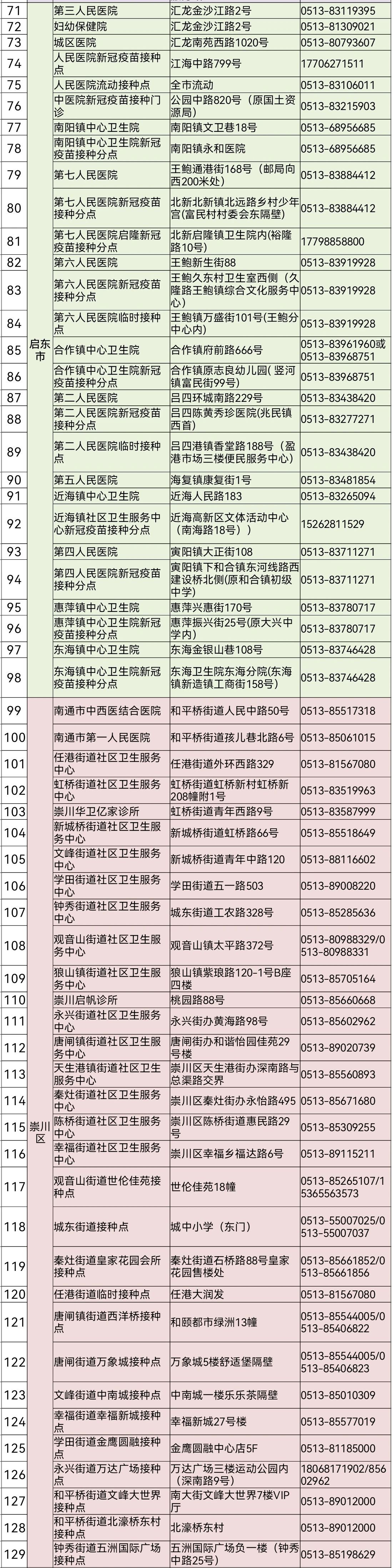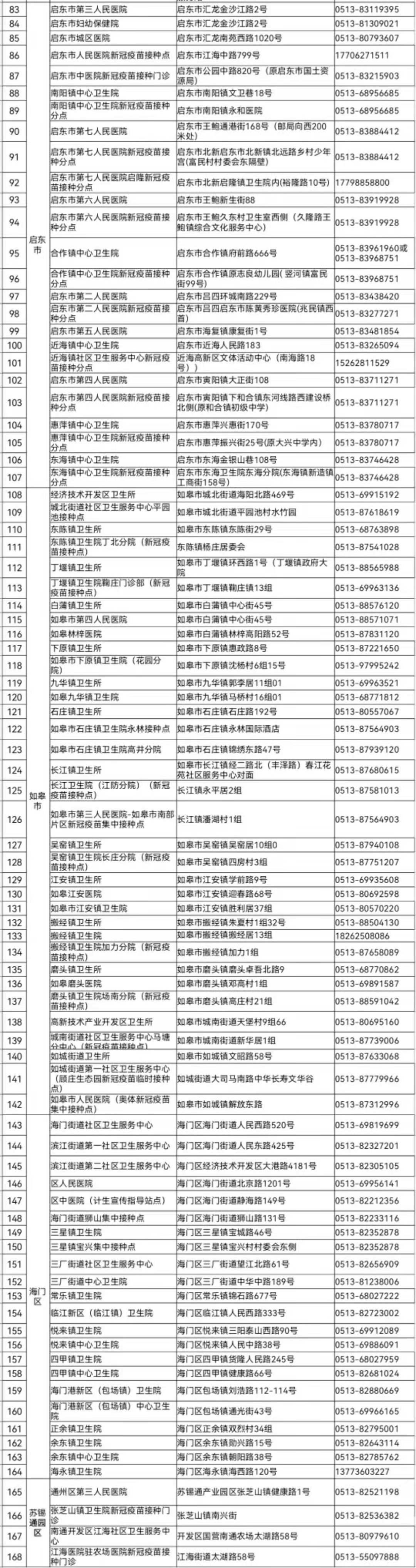 【南通新冠疫苗接种单位 184家】:(2021年8月更新)