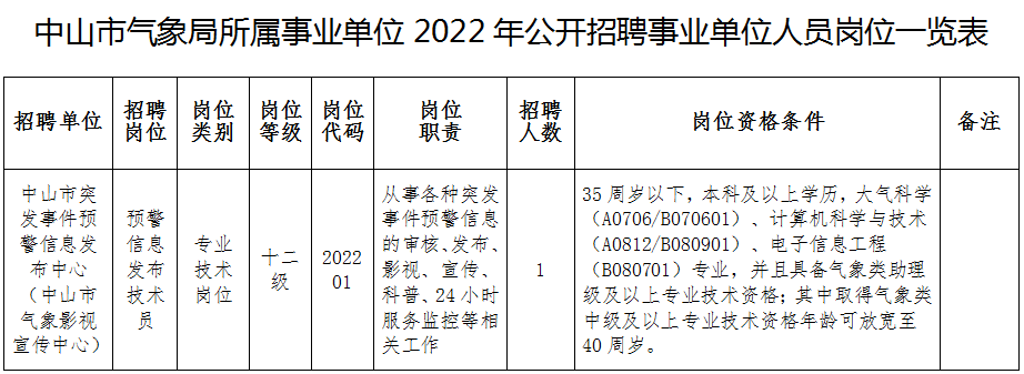 中山市突发事件预警信息发布中心招聘事业单位人员