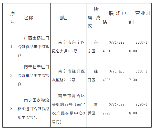 附件:南宁市三家进口冷链食品集中监管仓名单