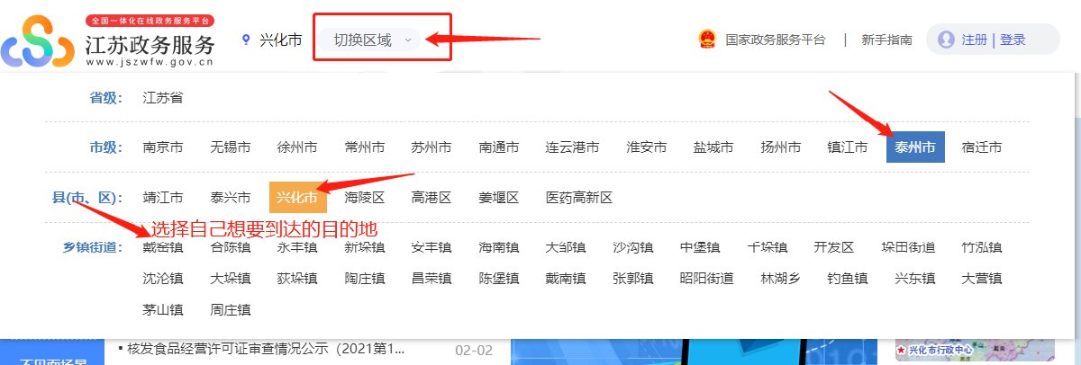 第一步:点击进入首页,在“切换区域”中选择“泰州市”——“兴化市”——乡镇街道