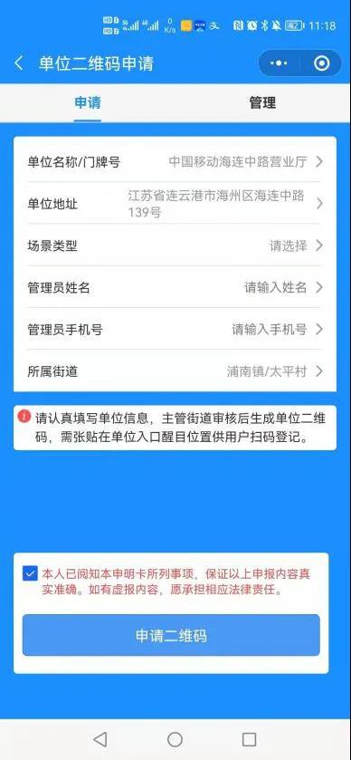 “康行海州”通行登记系统,每个经营主体需申请独立的二维码,并张贴在单位入口处,多个通道使用同一个二维码,具体申请步骤如下: