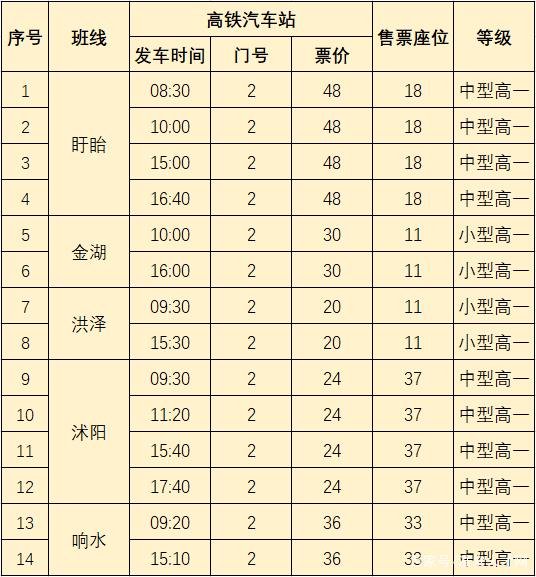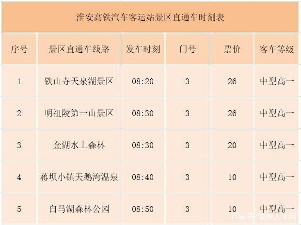 为方便广大旅客出行,淮安高铁汽车客运站(高铁路东侧,淮达路南侧)自2021年1月18日起,先期开通盱眙、金湖、洪泽、沭阳、响水等客运班车,后期将根据客流情况适时调整; 同日开通铁山寺天泉湖、明祖陵第一山、金湖水上森林、蒋坝小镇天鹅湾温泉、白马湖森林公园等淮安全域旅游景区直通车。
