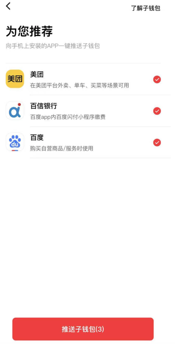 可以选择向手机上安装的APP一键推送子钱包,勾选之后可以看到“我的钱包”里面有同一个手机号注册的其他APP。部分APP目前上线了优惠活动,领取优惠券后,使用数字人民币支付可享优惠,如“美团APP”