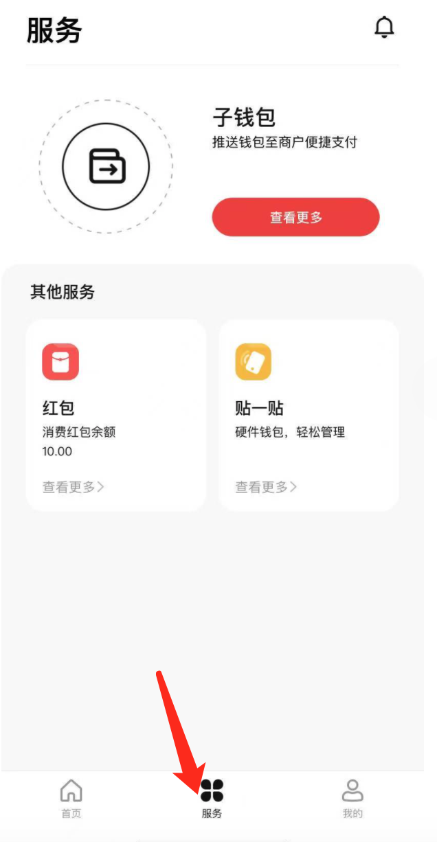 登陆“数字人民币app”之后,点击下方中间的“服务”,进入之后,点击“添加子钱包”。