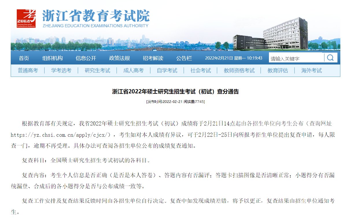 浙江省2022年硕士研究生招生考试(初试)查分通告