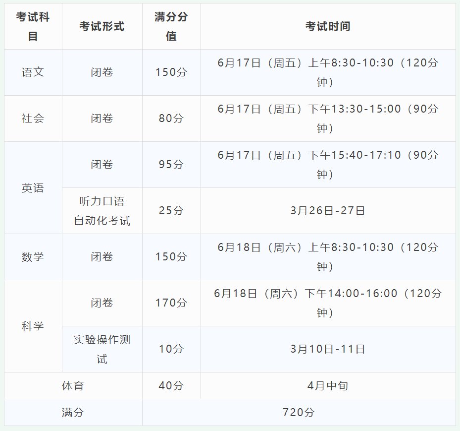 2022年中考具体考试日期、科目、考试形式、考试时间、满分分值见下表: