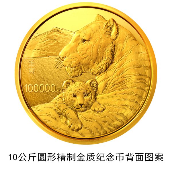 10公斤圆形金质纪念币、2公斤圆形金质纪念币和1公斤圆形银质纪念币背面图案均为写实风格母子虎造型,衬以远山等设计元素。