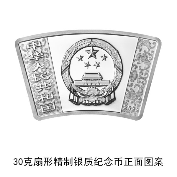 (十二)30克扇形银质纪念币为精制币,含纯银30克,外圆半径85毫米,内圆半径60毫米,圆心角30度,面额10元,成色99.9%,最大发行量30000枚。