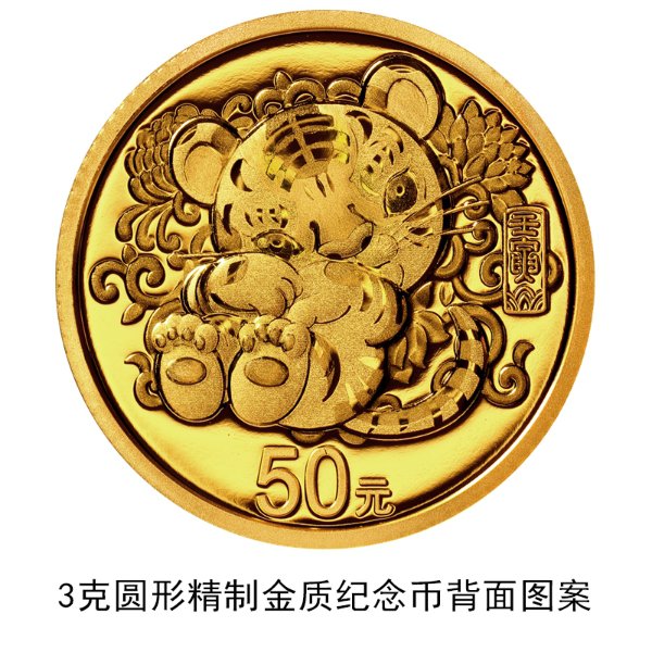 3克圆形金质纪念币和15克圆形银质纪念币(彩色)背面图案均为卡通风格小虎造型,衬以吉祥花卉等装饰。
