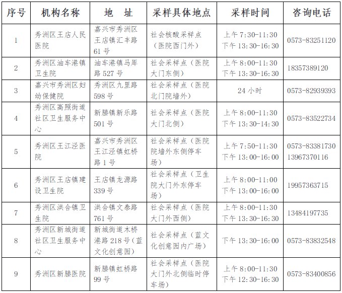 嘉兴市秀洲区新冠病毒核酸检测采样点(地址、时间、电话)(更新于2022年3月12日)