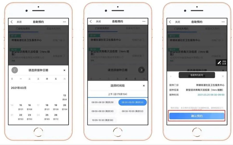 前两步完成后,选择要接种的接种日期。选择日期可以对应看到接种门诊每日所剩的余号。选择需要去的接种时间段后点击“确认预约”显示疫苗预约成功。
