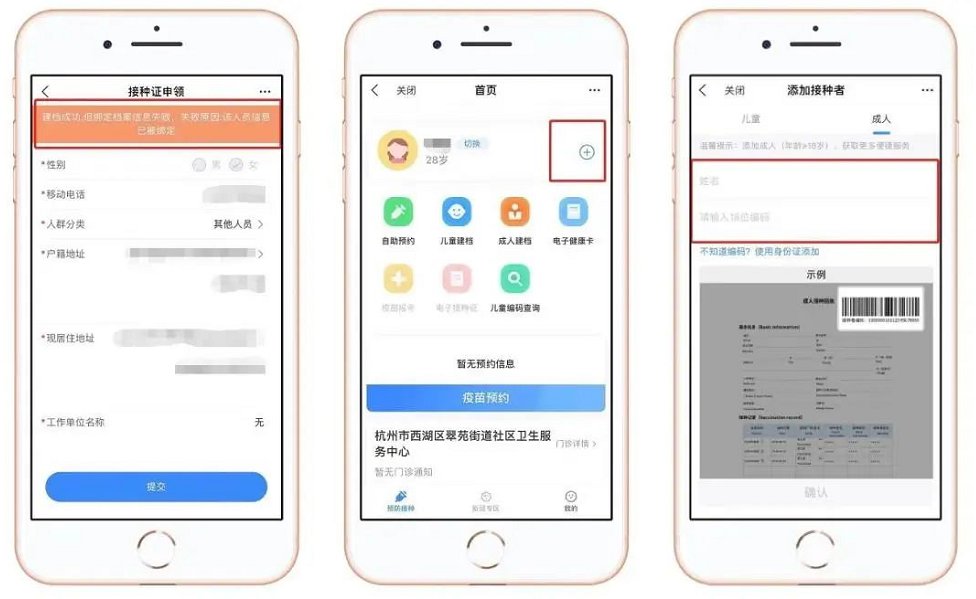 如果提示“建档成功,但是绑定信息失败”说明您已经在系统里有成人档案里,这时点击【首页】个人信息“+”添加接种者,使用姓名和成人18位编码进行绑定,也可以使用身份证添加绑定。
