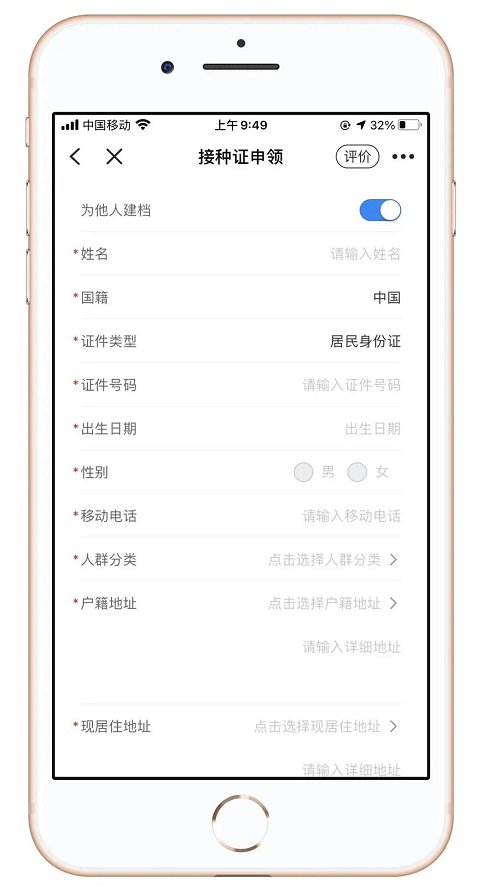 在跳转页填写成人基本信息、户籍地址、现居住地址、工作单位名称后,点击【提交】进行申领,会显示建档成功。申领完成后可切换至【我的】标签页,点击【我的申领】进行查看已申领的电子接种证。