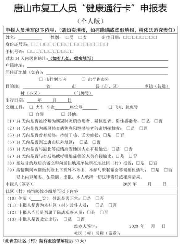 (二)个人自行申报。申请人自行如实填报《唐山市复工人员“健康通行卡”申报表(个人版)》,所在社区(村)居(村)委会审核信息完整性后,在“健康通行卡”上加盖公章生效。