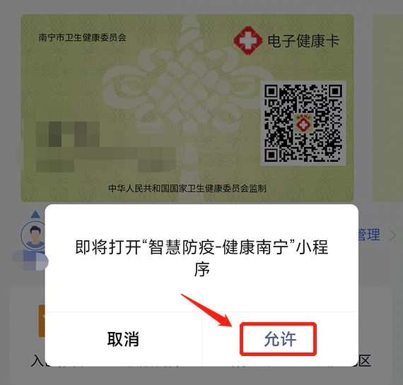 1、使用微信扫描下方“南宁市电子健康卡”二维码,打开小程序,点击“入邕报备”,跳转至“智慧防疫-健康南宁”小程序。