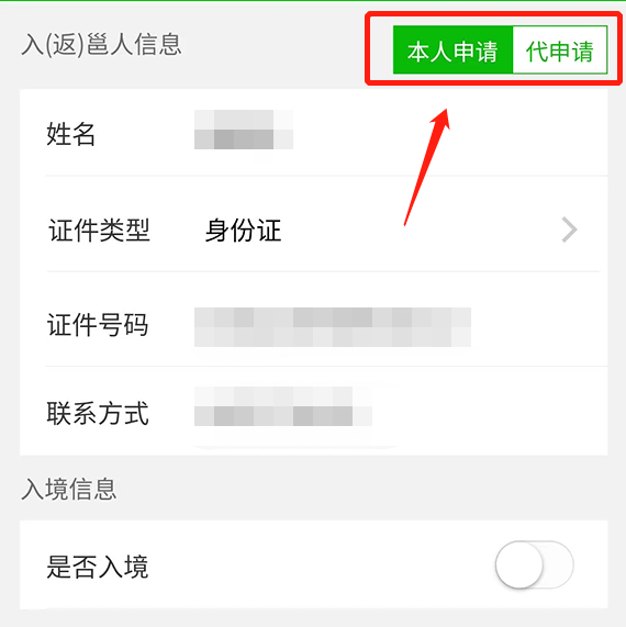 3、填写入邕报备信息后提交即可,顶部左侧可切换“本人申请”“代申请”。