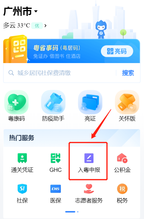 1、打开“粤省事”小程序,选择“入粤申报”模块。