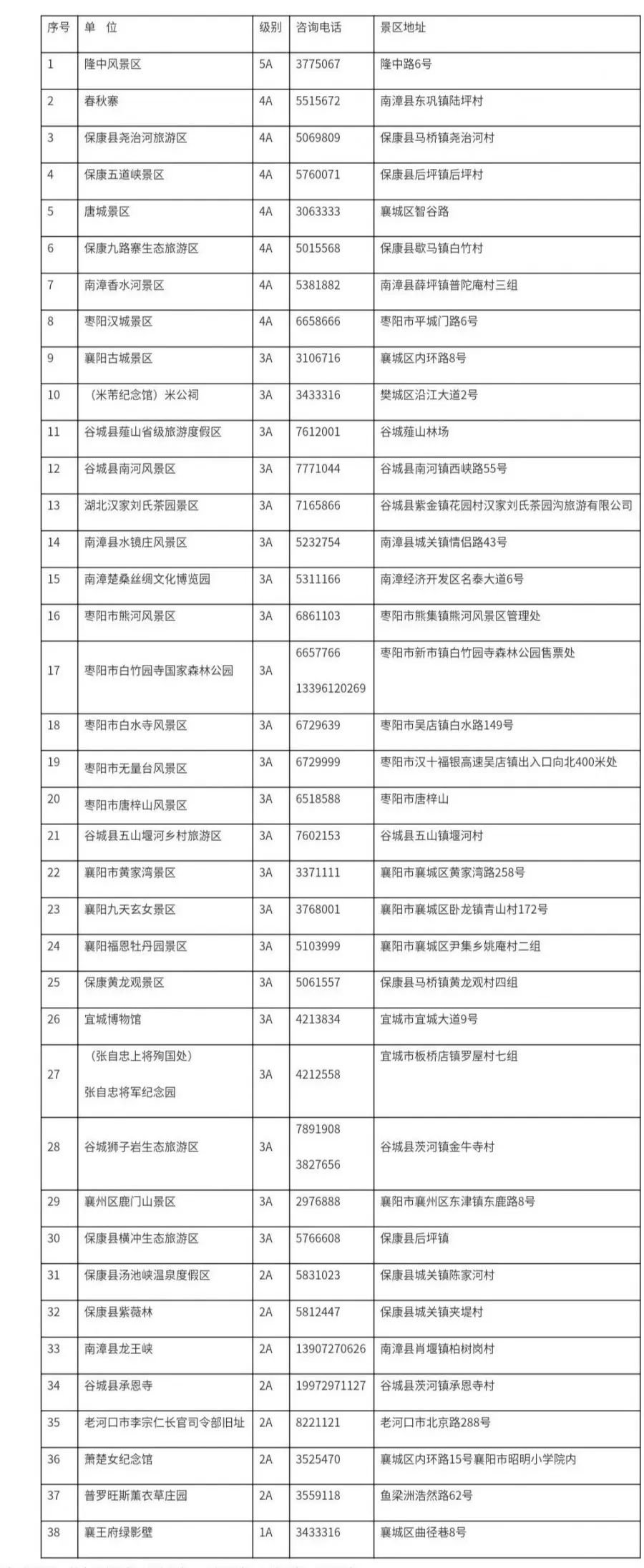 湖北省襄阳市A级景区名录