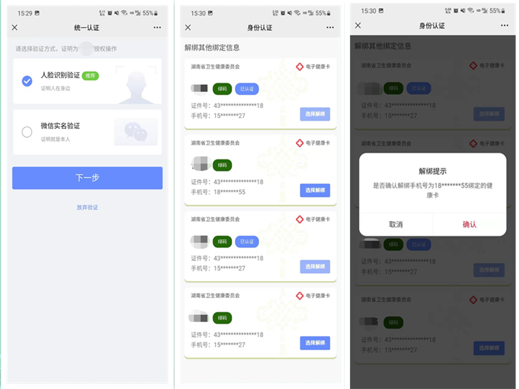 注:“管理健康卡”中仅显示您健康卡在其他微信中的绑定信息,且仅可解绑未通过人脸认证的其他微信绑定信息。