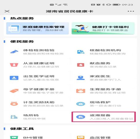 1、在湖南居民健康卡“便民服务”中点击“返湘报备”;