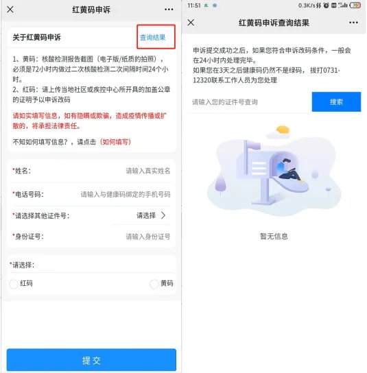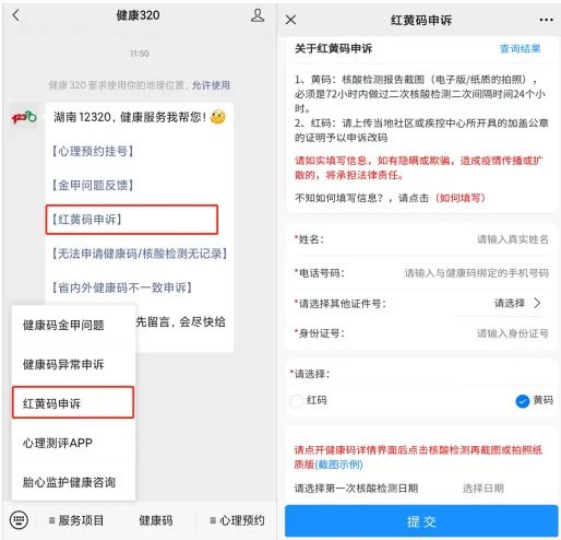 第二步,点击左下角“服务项目”中的“红黄码申诉”或者点击回复中的“红黄码申诉”,填写正确的个人信息以及“三天两检”(72小时内两次核酸检测证明,且两次监测时间间隔在24小时以上)核酸检测截图。红码人员还需提供上传当地疾控部门盖公章证明。