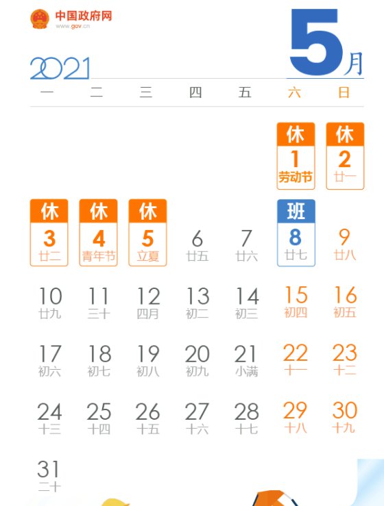 5月1日(星期六)至5日(星期三)放假调休,共5天。