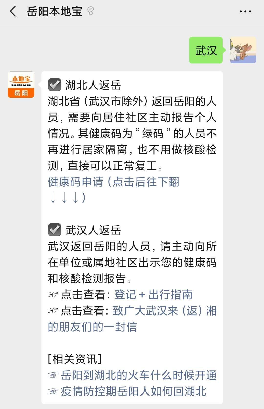 进入我们的微信公众号“岳阳本地宝”,回复:武汉,就可以查看湖北人返回岳阳最新规定的消息,以及健康码申请指南。