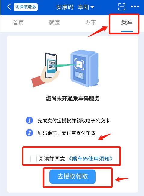 第二步:切换至”乘车“页面后,勾选“阅读并同意《乘车码使用须知》”后点击“去授权领取”